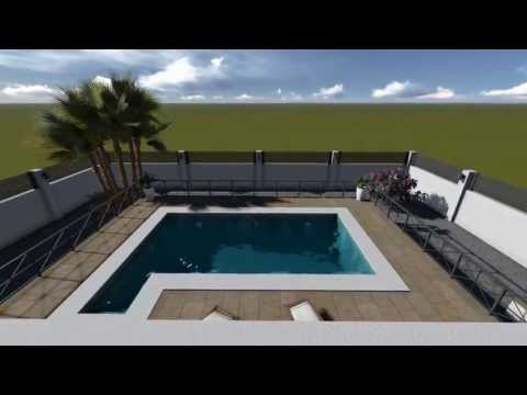 El exterior se compone de zona de parking bajo pérgola, área de terraza con piscina y zona de jardín compuesta por gravilla, palmeras y plantas variadas.