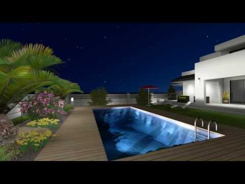 El exterior se compone de zona de parking bajo pérgola, área de terraza con piscina y ducha exterior y zona de jardín compuesta por gravilla, palmeras y plantas variadas.